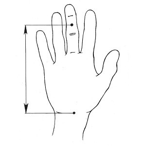 Для определения размера измеряется кисть руки от запястья до середины средней фаланги среднего пальца. Если измерения попали между размерами, выбирается ближайший размер.